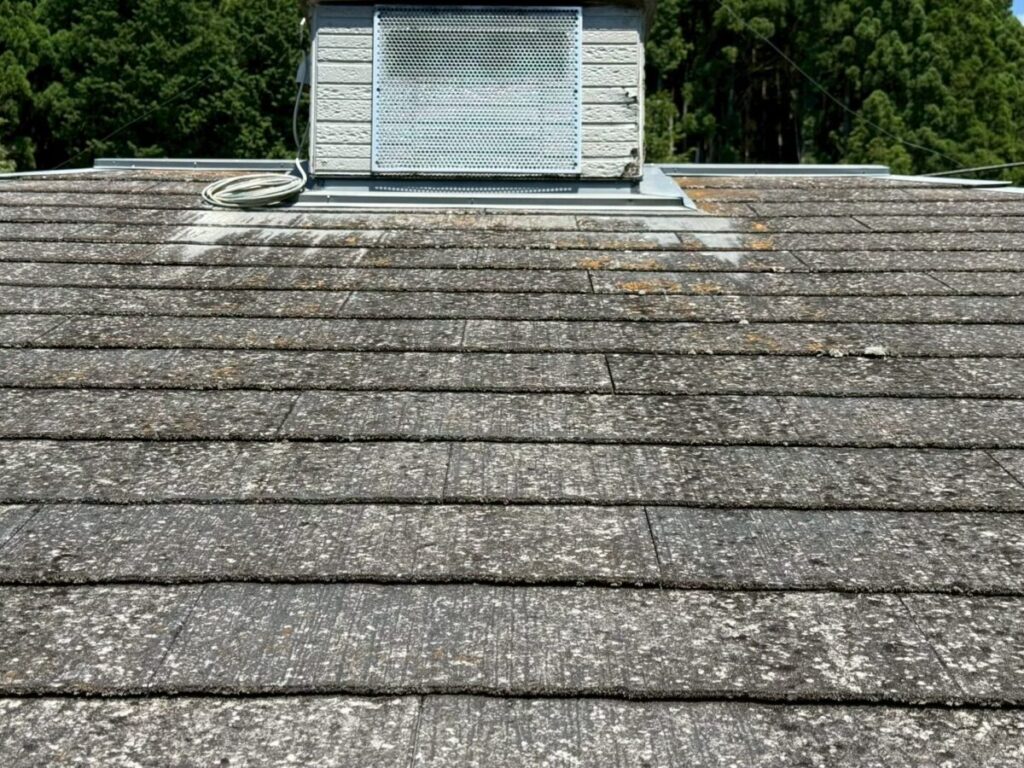 まず屋根の状態を確認しました。下からだと中々確認しずらく屋根は日常生活では見えにくい部分ですが、紫外線や雨風の影響を最も受けやすい箇所です。
