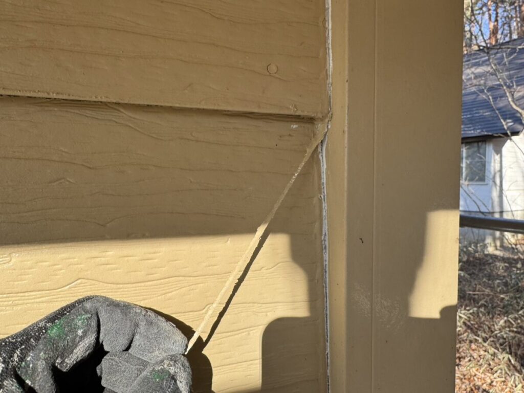本日は既存シーリングの撤去作業を行いました。シーリングは外壁材の継ぎ目を埋め、防水と緩衝の役割を担う重要な部分です。