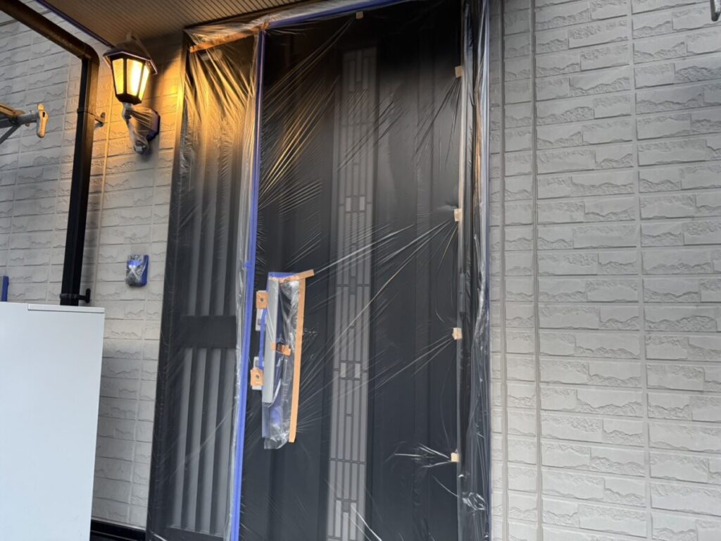 玄関ドアの養生こんな感じで出入りできるように施工しています。いつもご質問頂きますが出入りっってできますか?ってご質問頂きます。