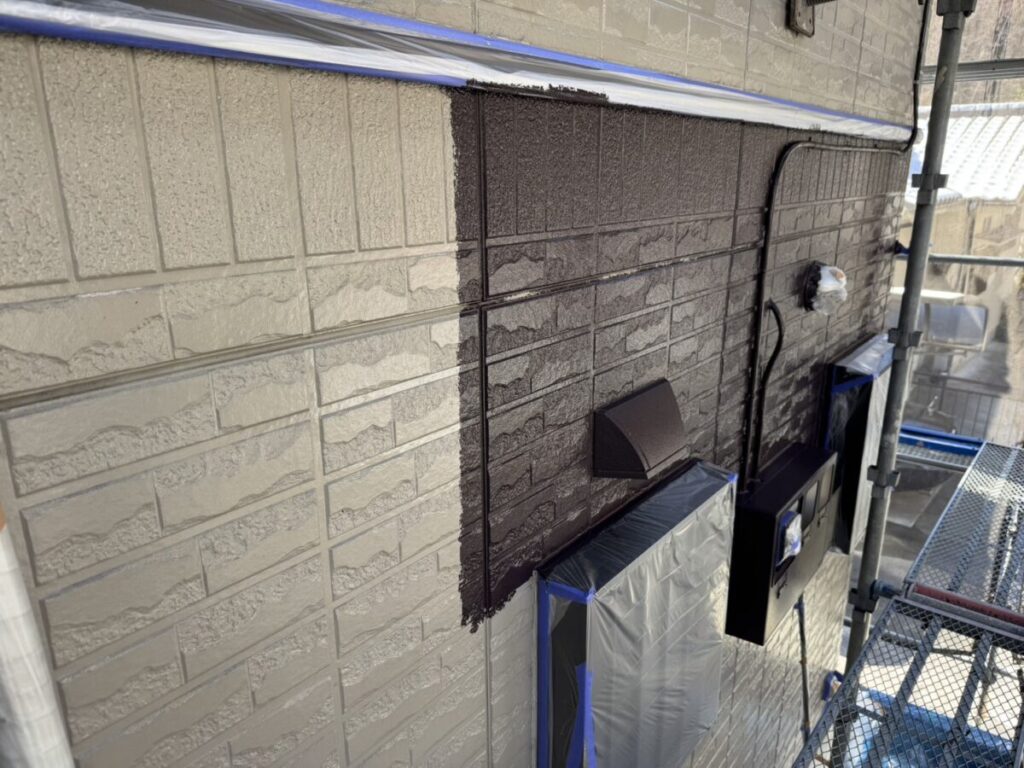 まず本日は、一階部分の施工になります。茶系の濃いお色で塗装していきます。J様とお打ち合わせの中今とは違う雰囲気を出していきたいなというお話しから二色のタッチで色分けをしています。