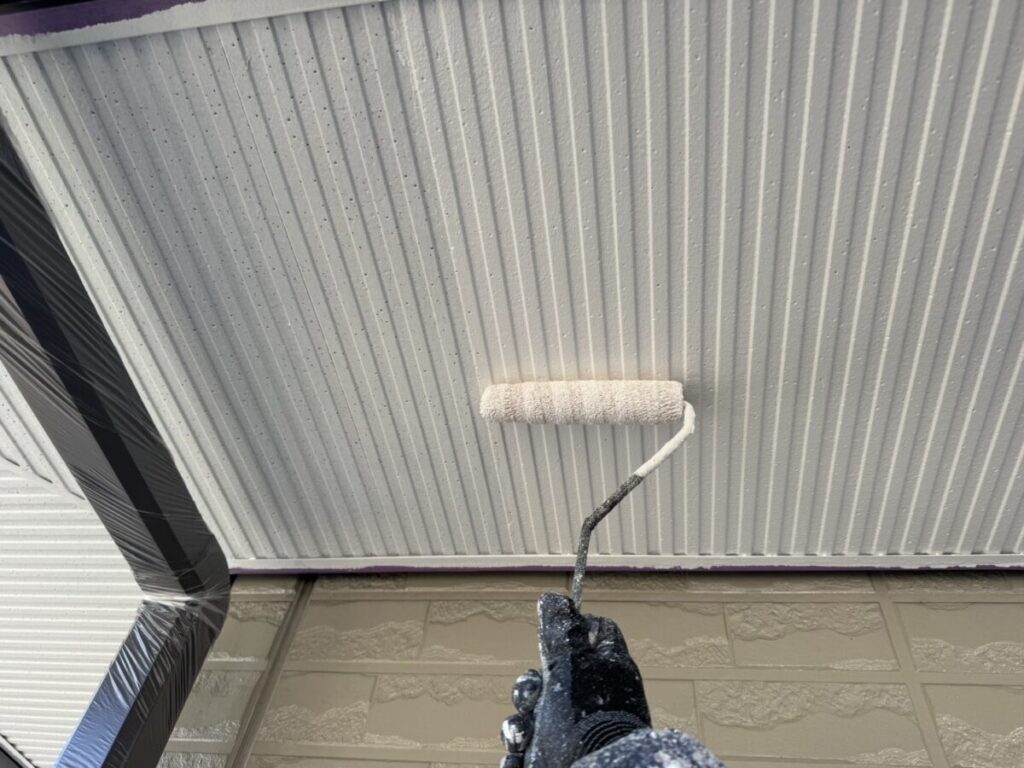 軒天上一回目。ケンエースの塗料を使用して防カビ・防腐の機能がある軒天専用の塗料を使用しました。色はN-90を使用して外壁との境を付けるためとアクセントをつけるために使用しました。