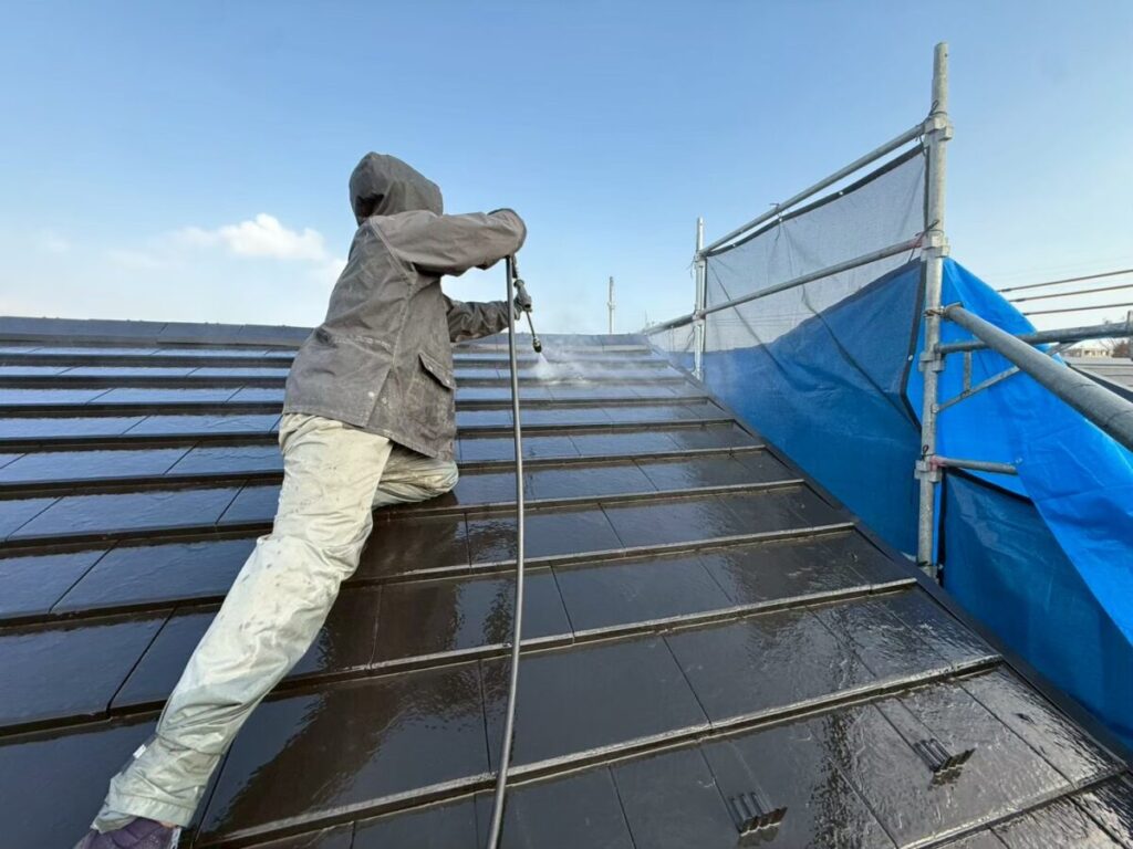 屋根に蓄積された汚れやカビ・苔を洗い流し下地を作ります!