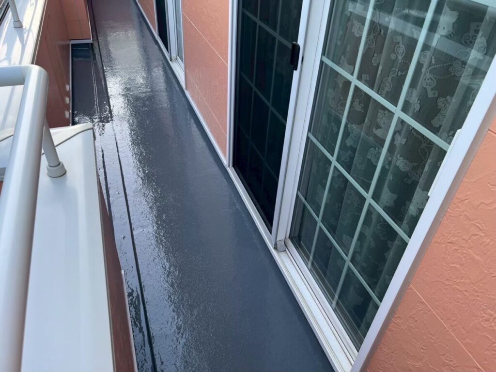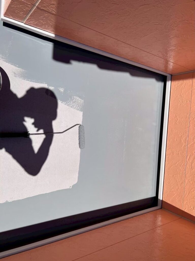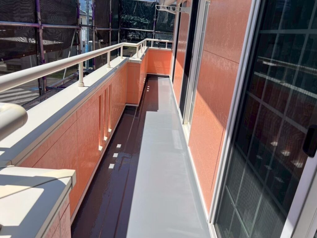 今回の工事では、H様より「ベランダ部分も年数的な劣化が気になる」とのご相談をいただきました。現地確認の結果、トップコートの摩耗や防水層の保護機能低下が見られたため、外壁塗装と同時にFRP防水の塗り替えを行うことになりました。同時施工により足場や工程を効率化できるだけでなく、建物全体の防水性能を一度に整えられるメリットがあります。ベランダは雨や紫外線の影響を直接受ける場所だからこそ、外装メンテナンスのタイミングで防水を見直すことが、長期的な住まいの保護につながります。(#^.^#)