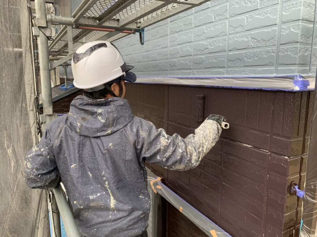 本日は、いよいよ一階・二階と外壁の中塗りを行いました。それでは早速ご紹介させて頂きます。一階は茶系で二階は今回青みがかったグレーでの塗装をさせて頂きました。